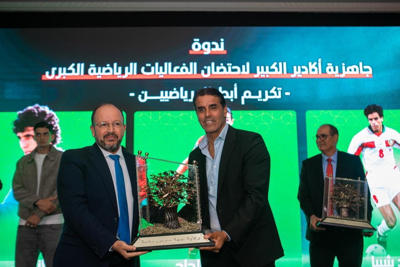 وشهدت الندوة كذلك تكريم مجموعة من الأبطال الرياضيين، من بينهم بادو الزاكي وسعيد شيبا وحنان آيت الحاج وإلياس موعتيق وحمو ومحال، إضافةً إلى تكريم جماهير فريق حسنية أكادير المتوجة ببطولة الجماهير الوطنية.